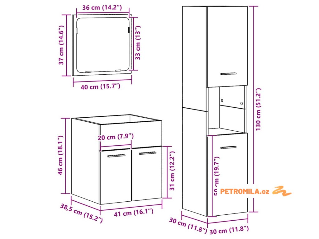 - 1 x Koupelnová skříňka: 30 x 30 x 130 cm (D x Š x V)