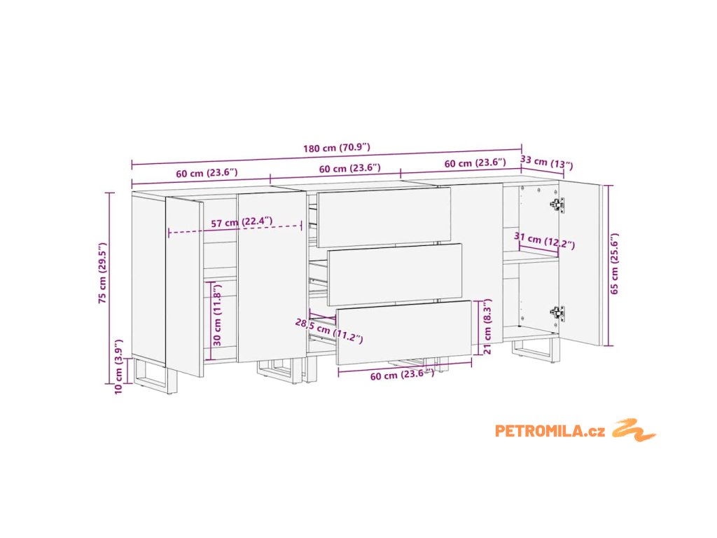 - Celkové rozměry: 180 x 33 x 75 cm (D x Š x V)