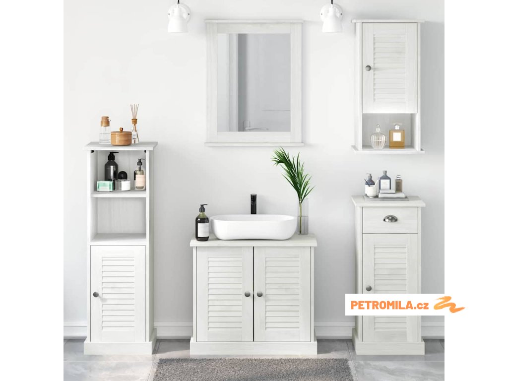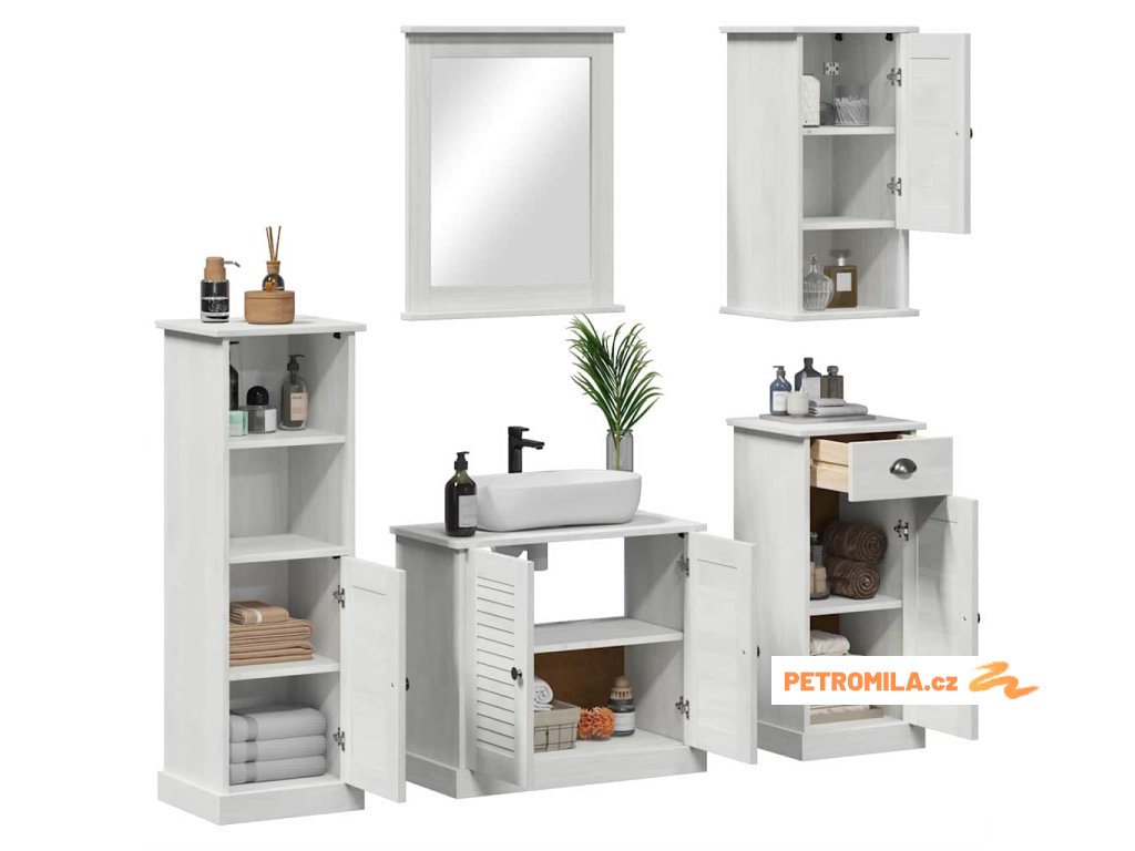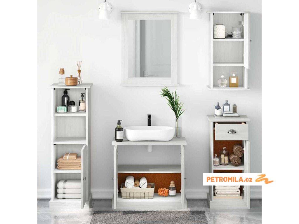 Masivní Konstrukce z Borového Dřeva Tato sada je vyrobena z vysoce kvalitního masivního borového dřeva, známého svou odolností a nadčasovým vzhledem. Přírodní textura dřeva zvýrazňuje rustikální eleganci, odolává každodennímu používání a nabízí trvalou přírodní krásu. Vhodná pro každého, kdo chce do svého domova začlenit organické prvky.,Patented Plane Mirror Se svým plochým zrcadlem je to ideální volba pro každodenní úpravy a pozorování symetrie dekoru. Nabízí přesná a přímá odrazy, které odpovídají velikosti vašeho obrazu, což činí toto zrcadlo velmi vhodným pro různé úkoly úpravy.,Dveře na Pantech s Knoflíkovými Rukojetmi Tato sada využívá dveře na pantech, což usnadňuje přístup do interiérů, aniž by to měnilo uhlazenou estetiku. Knoflíkové rukojeti umožňují bezproblémové používání a dodávají dotek vintage gráce rustikální atmosféře sady.,Policové Desky pro Prostorné Úložiště Policové desky v sadě poskytují prostorný prostor pro vaše potřeby, podporující organizované úložiště. Ať už pro ručníky, kosmetiku nebo jiné nezbytnosti, efektivně využívají vertikální prostor a přitom si zachovávají minimalistický vzhled.,Odolnost vůči Teplu Odolnost nábytku vůči teplu znamená, že vydrží teplé prostředí, zajišťující prodlouženou efektivitu i při kolísajících teplotách. Tento prvek zajišťuje, že váš nábytek zůstane v nejlepším stavu, což je ideální pro koupelnová prostředí.- Barva: Bílá s patinou