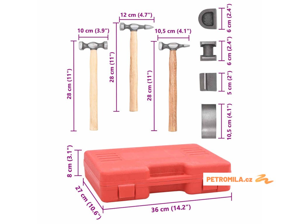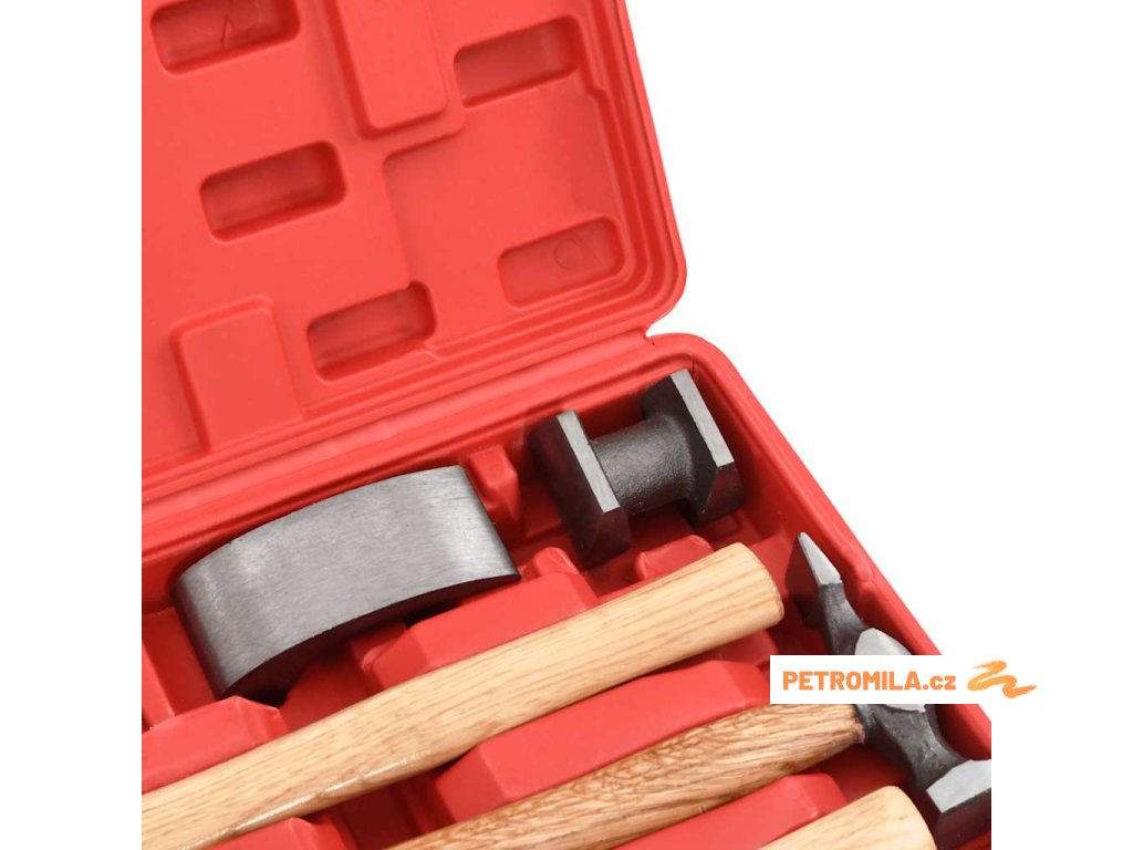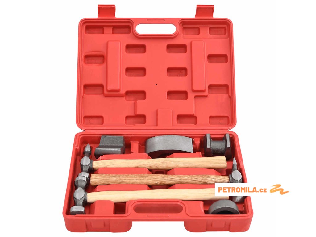Balení obsahuje 1 x karosářské kladivo, kladivo ploché, 1 x kladivo špičaté, 1 x víceúčelová babka, 1 x vypouklá babka, 1 x autokarosářská lžíce, 1 x kovadlina a 1 x červené pouzdro z foukaného plastu.