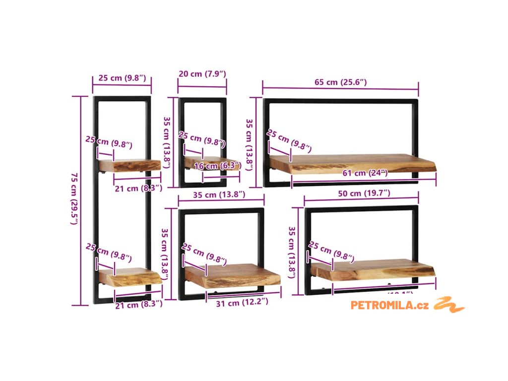 Tato sada nástěnných polic sestává z 5 poliček různých velikostí, které svým retro designem promění každou prázdnou zeď v dekorativní záležitost. Police z masivního dřeva se výborně hodí k vystavování nejrůznějších věcí, jako jsou knížky, ocenění, sběratelské předměty, ozdoby apod.