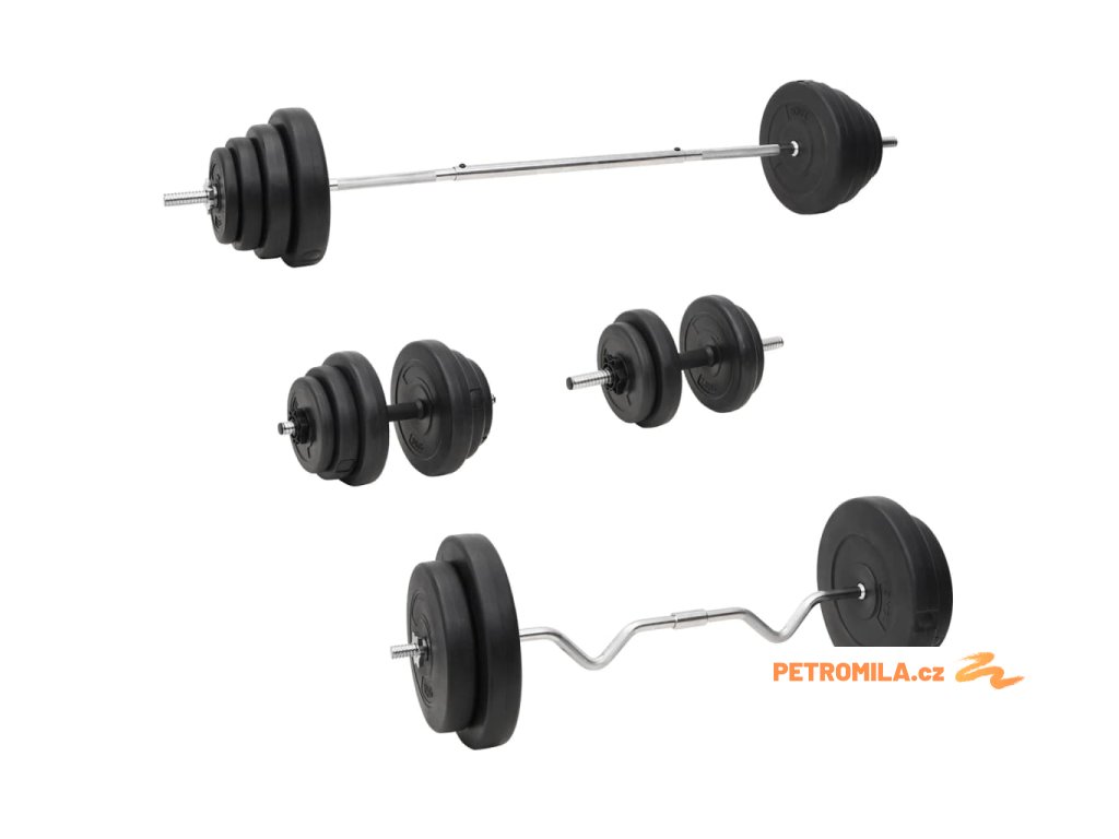 - Hmotnost kotoučů: 2x 7,5 kg, 6x 2,5 kg, 6x 1,25 kg, 4x 5 kg, 2x 15 kg, 2x 10 kg