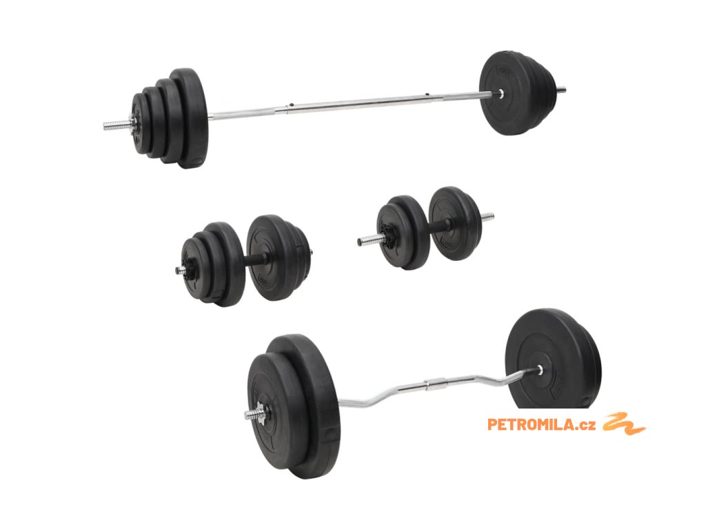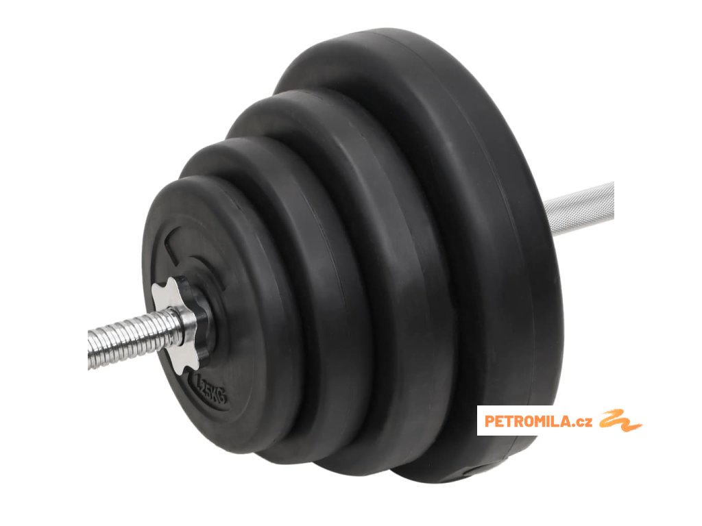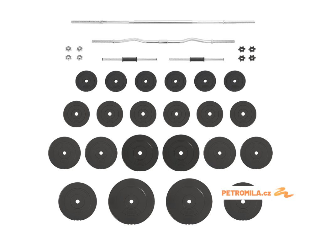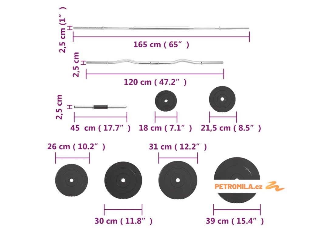 - Hmotnost kotoučů: 2x 7,5 kg, 6x 2,5 kg, 6x 1,25 kg, 4x 5 kg, 2x 15 kg, 2x 10 kg