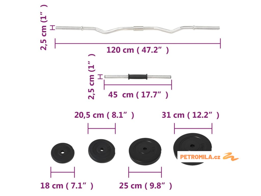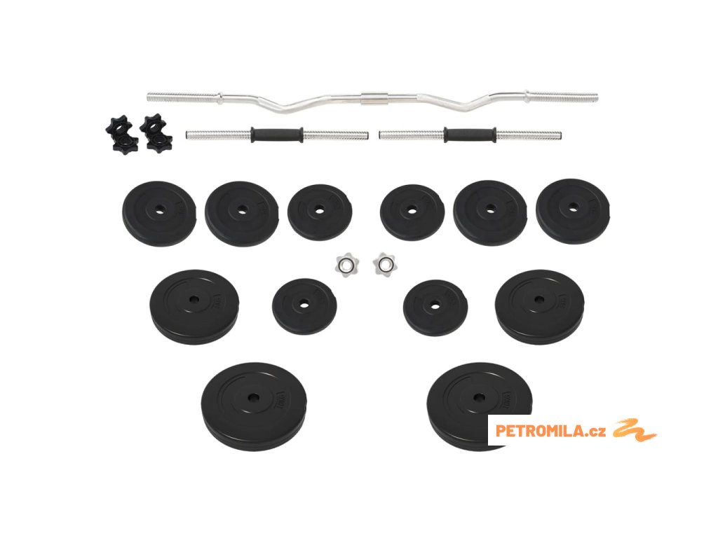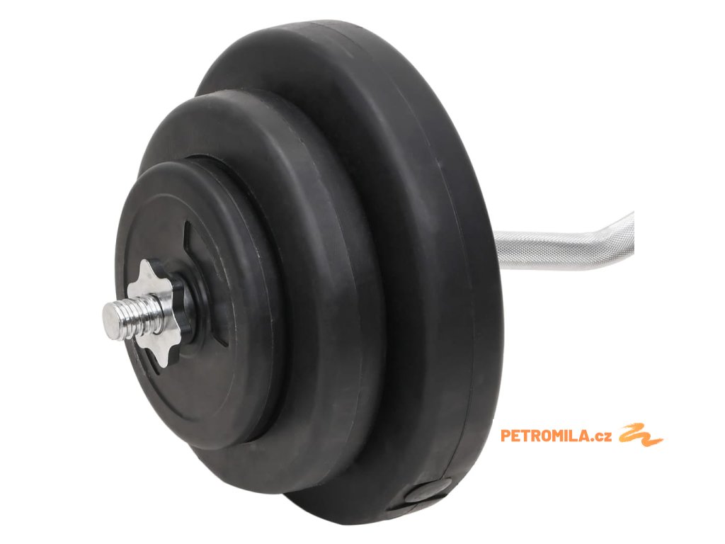 - Hmotnost kotoučů: 2x 10 kg, 4x 5 kg, 4x 2 kg, 4x 1,25 kg