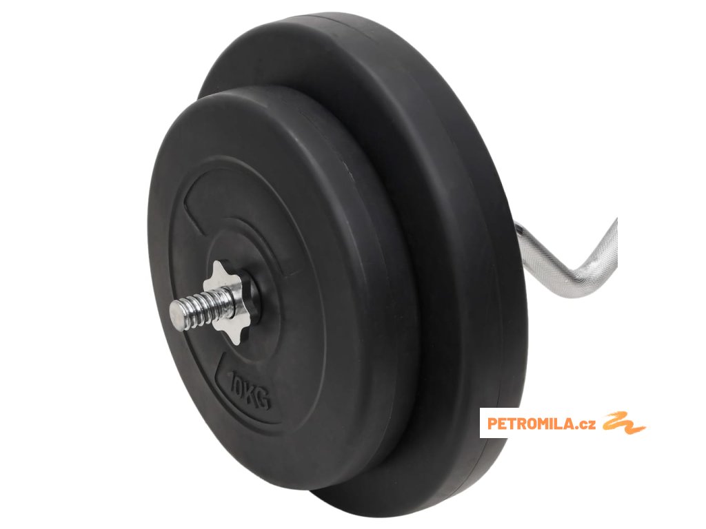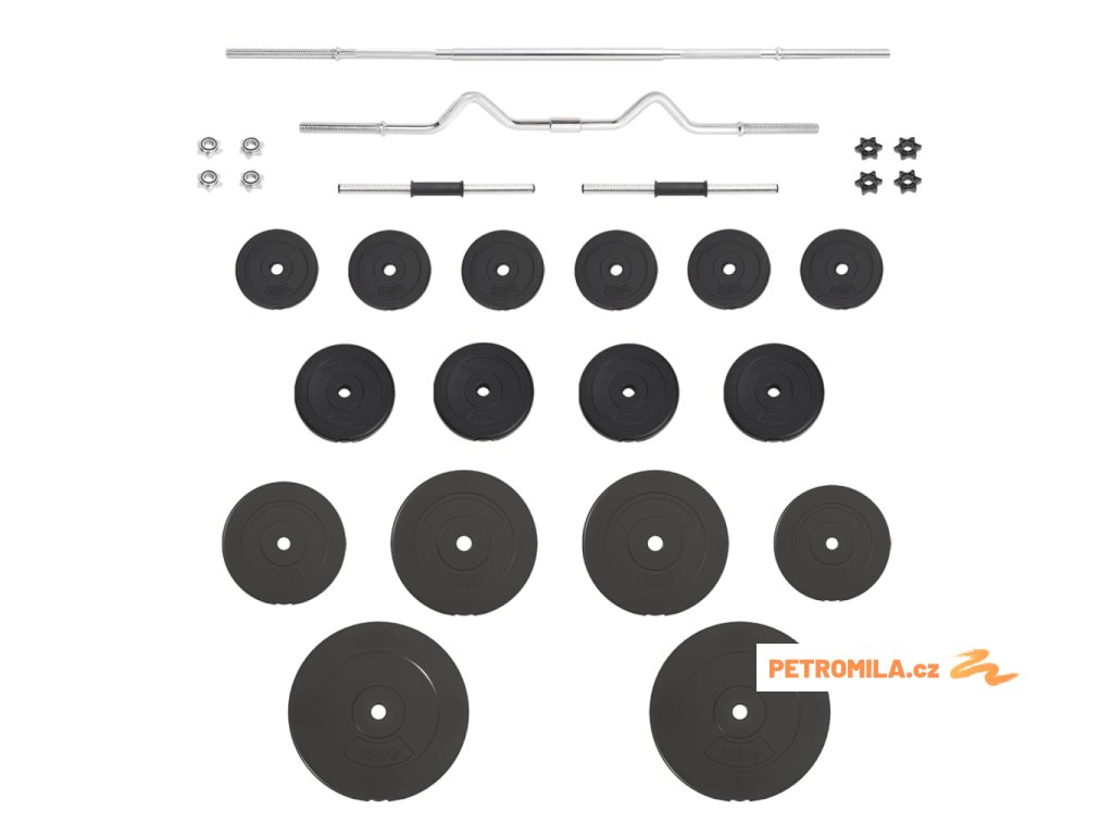 - Hmotnost kotoučů: 4x 2,5 kg, 6x 1,25 kg, 2x 10 kg, 2x 5 kg, 2x 15 kg