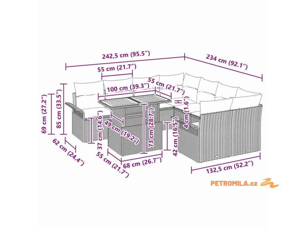 - Péče a údržba: Zachovejte vzhled soupravy používáním krytu, když není v provozu, a otírejte ji suchým hadříkem. Polštáře mají zipy pro snadné sundání a údržbu, což zajišťuje dlouhou životnost i během různých sezón.