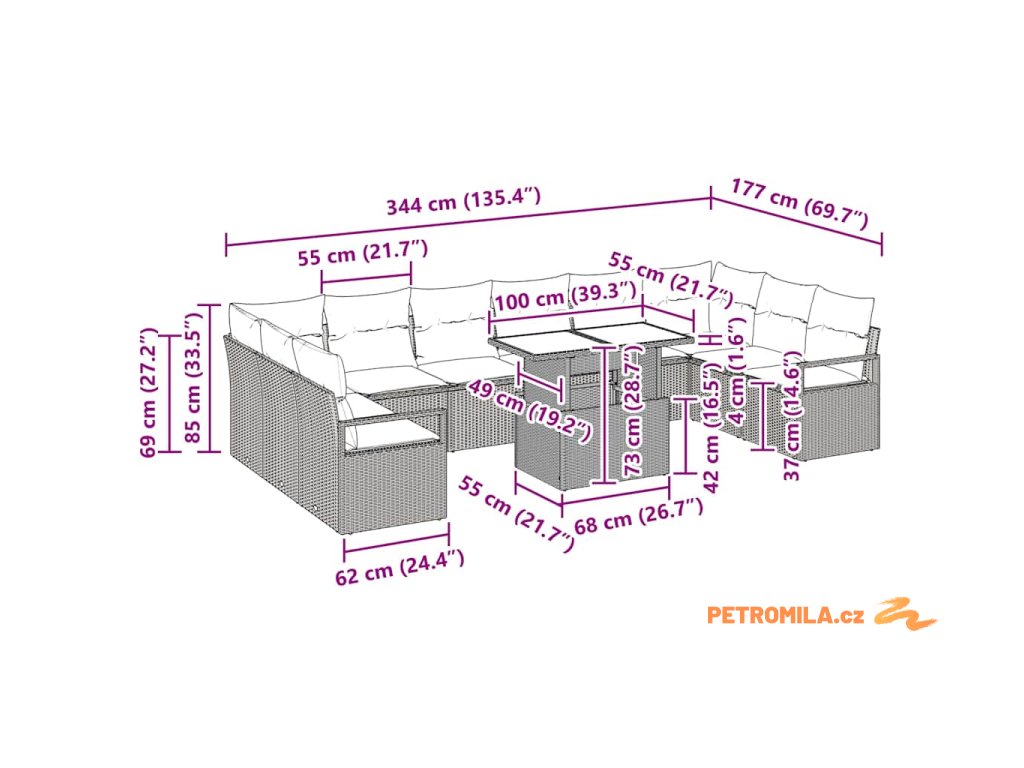 - 6 x střední sedátko: 55×62×85 cm (D׊×V)