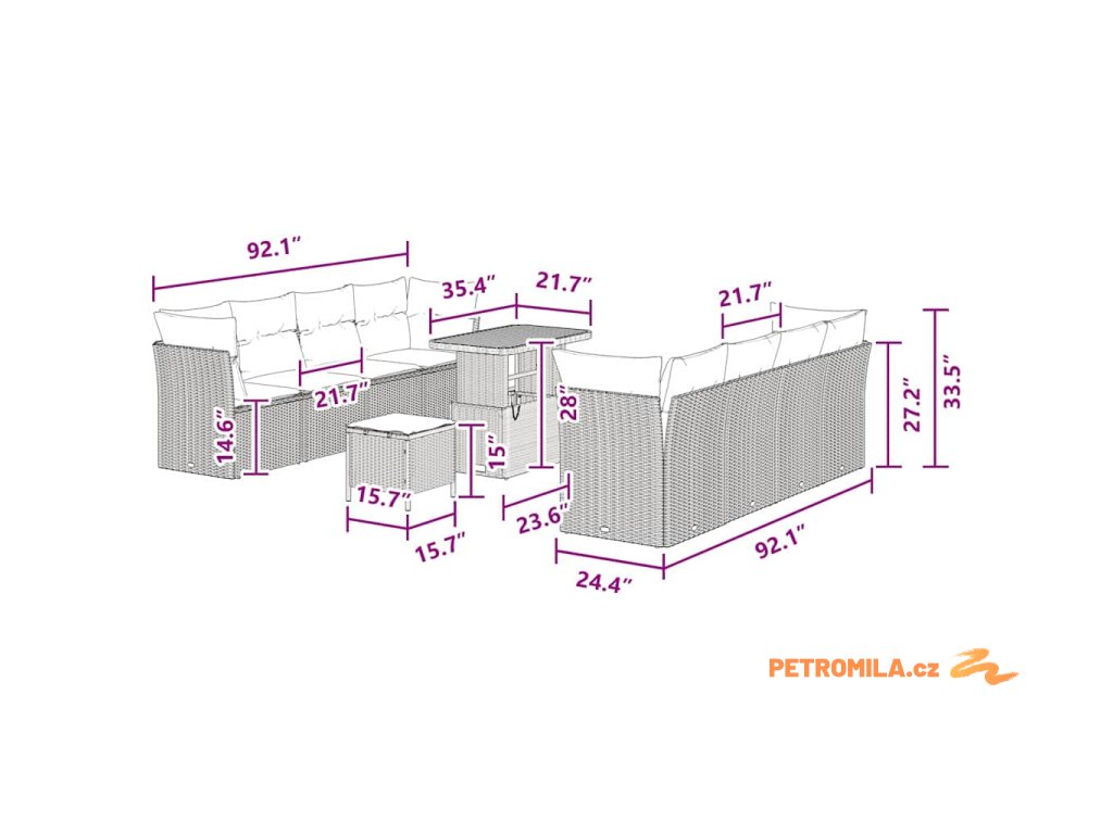 - Kompletní součásti zahradního setu: Tento univerzální set zahrnuje čtyři rohová sedadla, čtyři středová sedadla, dvě stoličky a stůl, což umožňuje velkým shromážděním nebo intimním prostředím. Každý kus je promyšleně navržen pro zvýšení pohodlí a užitečnosti, což poskytuje více uspořádání sedadel pro společenské akce nebo osobní odpočinek.