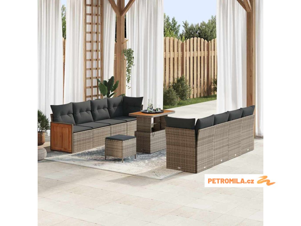 - Materiály: Pohovkový set je vyrobený z poly ratanu, takže odolává vlhkosti a UV záření. Po čase pořád skvěle vypadá a je nízkoúdržbový. Dřevo akácie dodává přírodní teplo ke stolu. Tyto materiály dohromady přinášejí moderní atmosféru a pohodlí, čímž pozvedají eleganci jakéhokoliv venkovního uspořádání.
