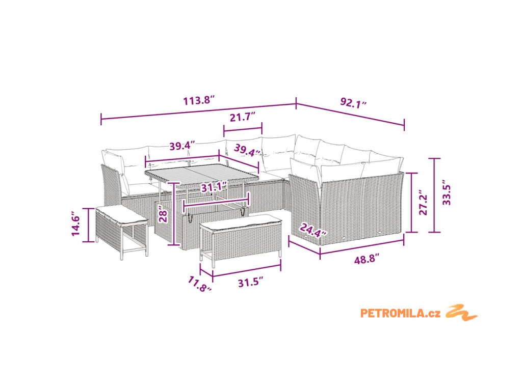 - Materiály: Udělaný z poly ratanu a práškově lakované oceli, tenhle sofa set spojuje styl s praktičností. Poly ratan mu dává luxusní tkaný vzhled, zatímco práškově lakovaná ocel zajistí, že nezrezaví - ideální volba na jarní a letní akce. Masivní akáciové dřevo dodává přírodní atmosféru, skvěle sladí moderni a rustikální styl.