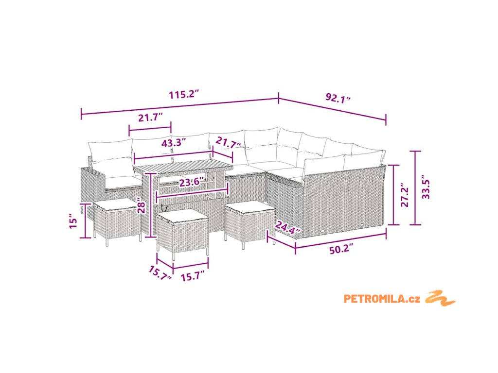 - 2x křeslo, 2x rohové sedadlo, 5x středové sedadlo, 3x stolička, 1x stůl