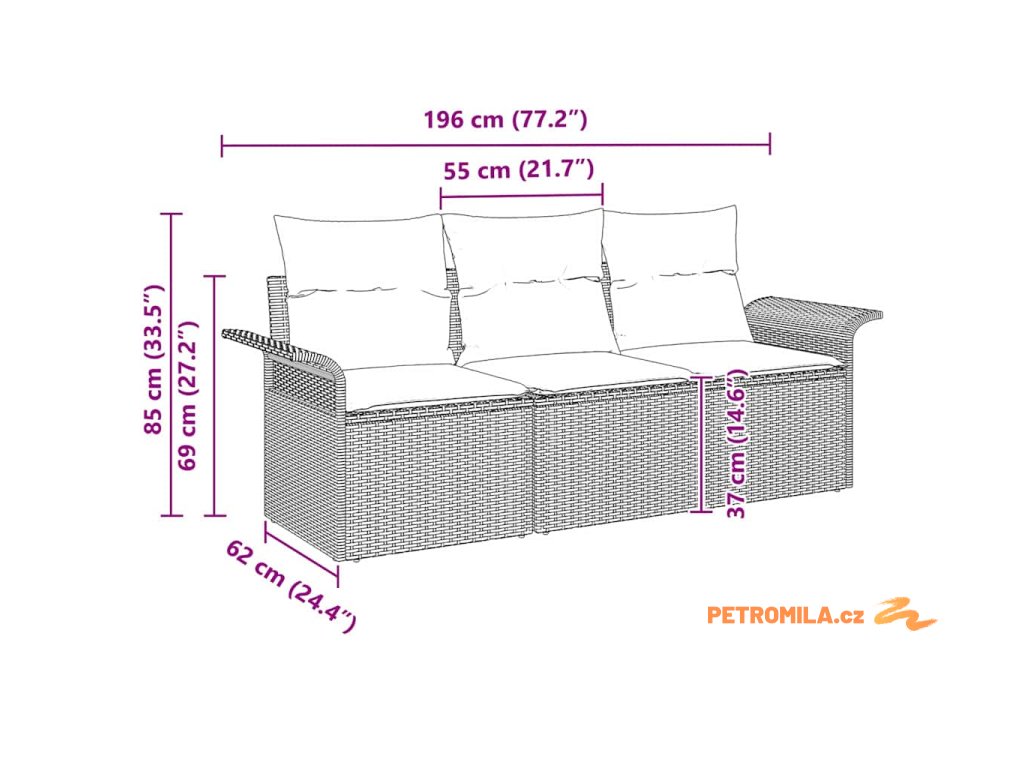 Sada zahradních pohovek 3 pcs Hnědá 196 x 62 x 85 cm polyratan