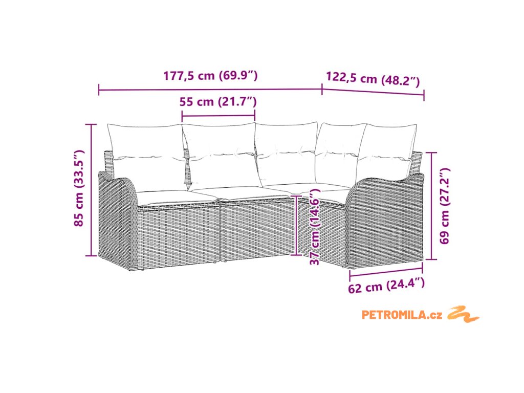 - 4 x sedací polštář: 55 x 55 cm (D x Š)