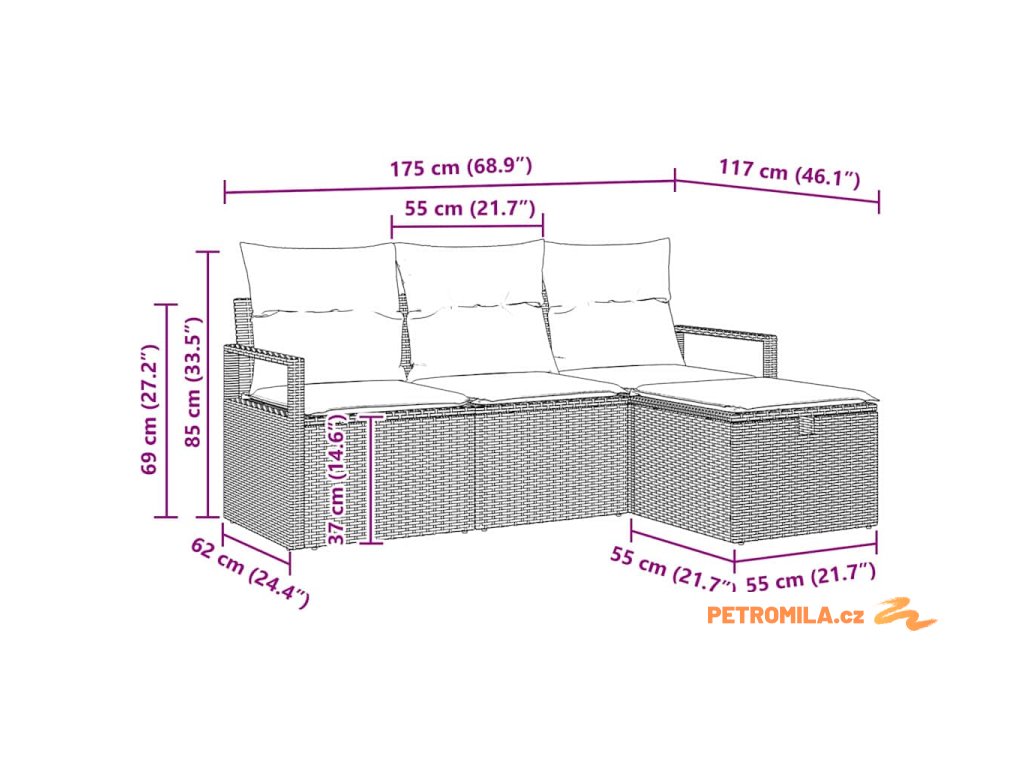 - Celkové rozměry: 175 x 117 x 85 cm (D x Š x V)