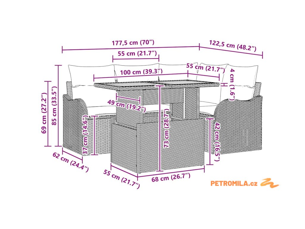 - Součásti: Souprava obsahuje dvě pohovky s opěrkami, rohové sedátko, středový sedák a zahradní stůl. Všechno je navržené pro maximální praktické využití a navíc je uvnitř křesel a stolu úložný prostor, aby venku vládnul pořádek.