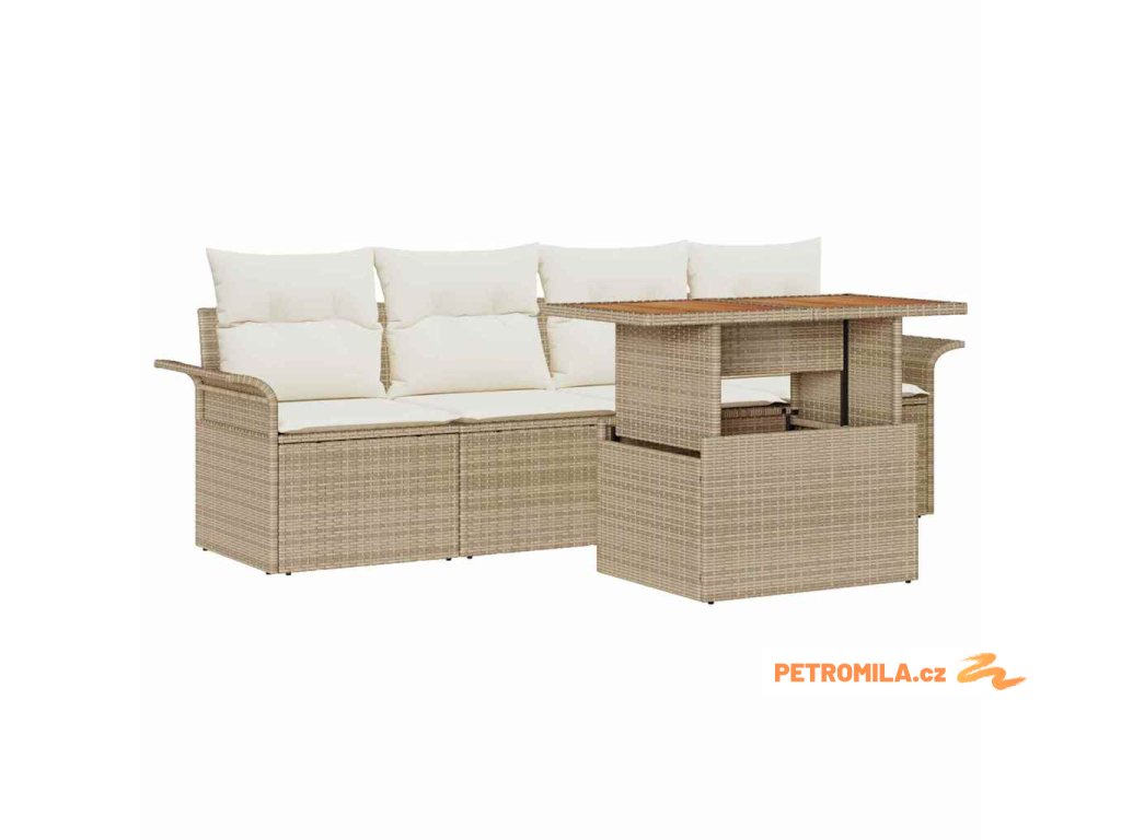 - Materiály: Tento zahradní nábytek je vyrobený z kvalitního polyratanu, práškově lakované oceli a masivního akáciového dřeva. Každý materiál byl vybrán pro svoji pevnost a vzhled. Polyratan drží moderní look, zatímco ocelový rám dodává stabilitu. Akáciové dřevo přináší přirozený pocit a dělá set odolný vůči jakýmukoli počasí.