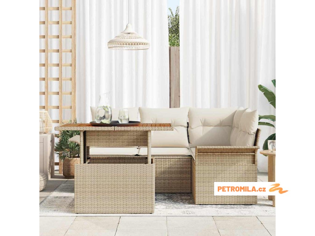 - Materiály a konstrukce: Vyrobena z odolného polyratanu, tato zahradní sedací souprava zajišťuje dlouhou životnost a skvělý vizuální dojem. Práškově lakovaná ocelová konstrukce poskytuje spolehlivou oporu, zatímco pevný akáciový dřevěný povrch nabízí přirozeně živý vzhled. Tyto materiály jsou pečlivě vybírány, aby zajistily maximální stabilitu, odolnost vůči počasí a atraktivní estetiku.