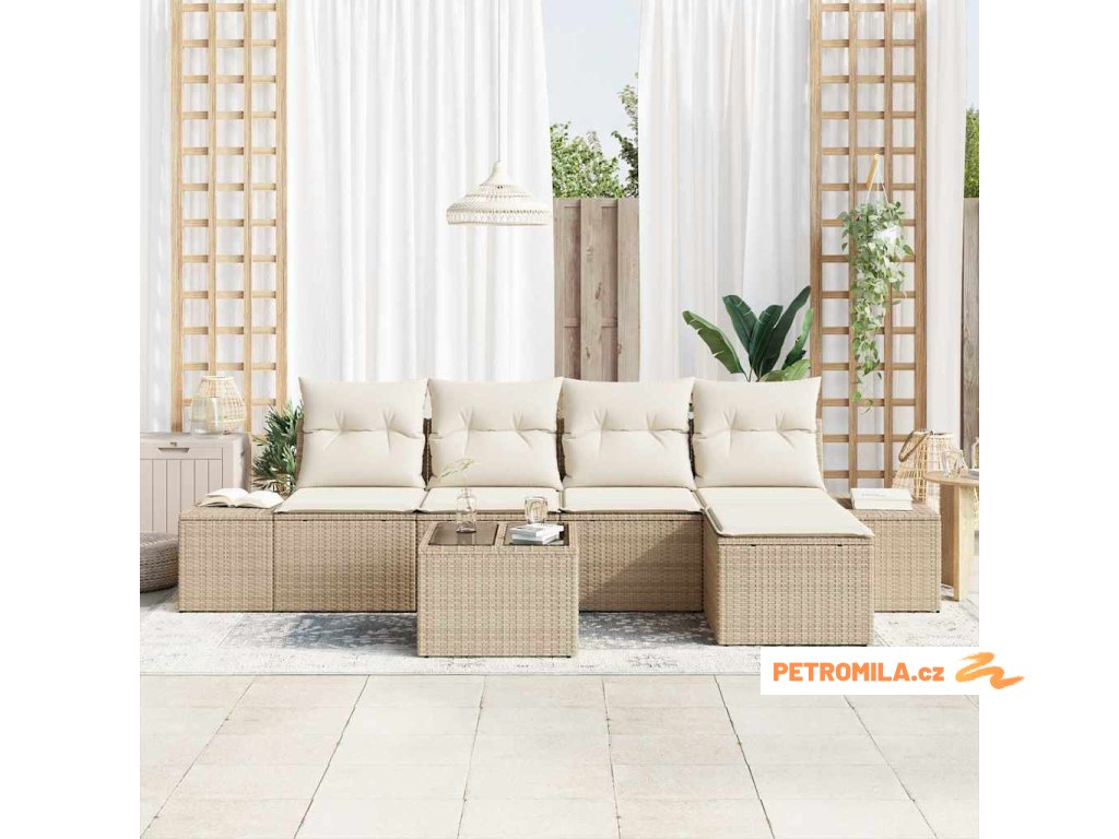 7dílný zahradní jídelní set s poduškami béžový polyratan