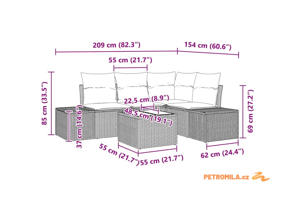 - 1 x Rohové sedadlo: 62 x 62 x 69 cm (D x Š x V)