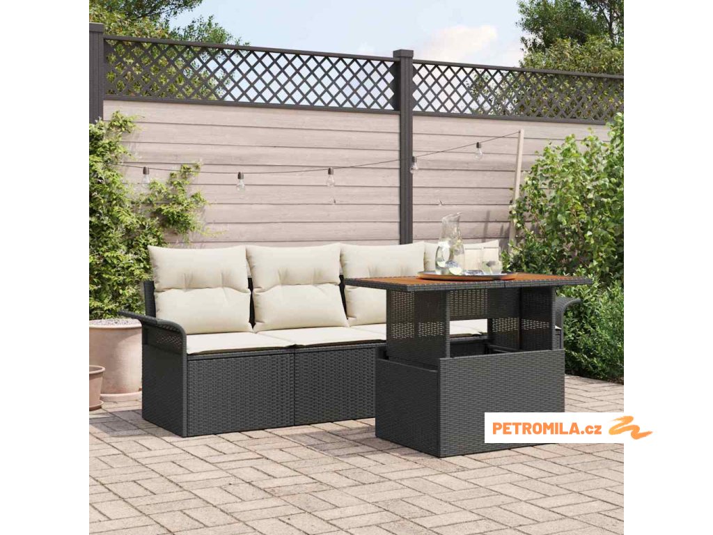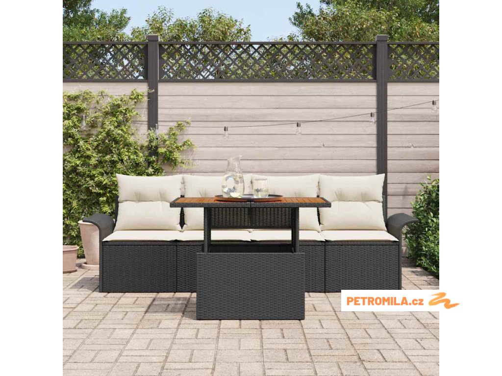 • Materiály: Tento zahradní nábytek je vyrobený z kvalitního polyratanu, práškově lakované oceli a masivního akáciového dřeva. Každý materiál byl vybrán pro svoji pevnost a vzhled. Polyratan drží moderní look, zatímco ocelový rám dodává stabilitu. Akáciové dřevo přináší přirozený pocit a dělá set odolný vůči jakýmukoli počasí.