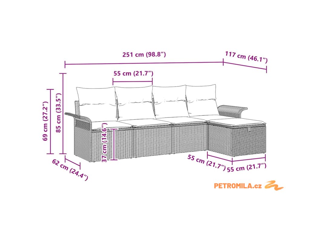 - Celkové rozměry: 251 x 117 x 85 cm (D x Š x V)
