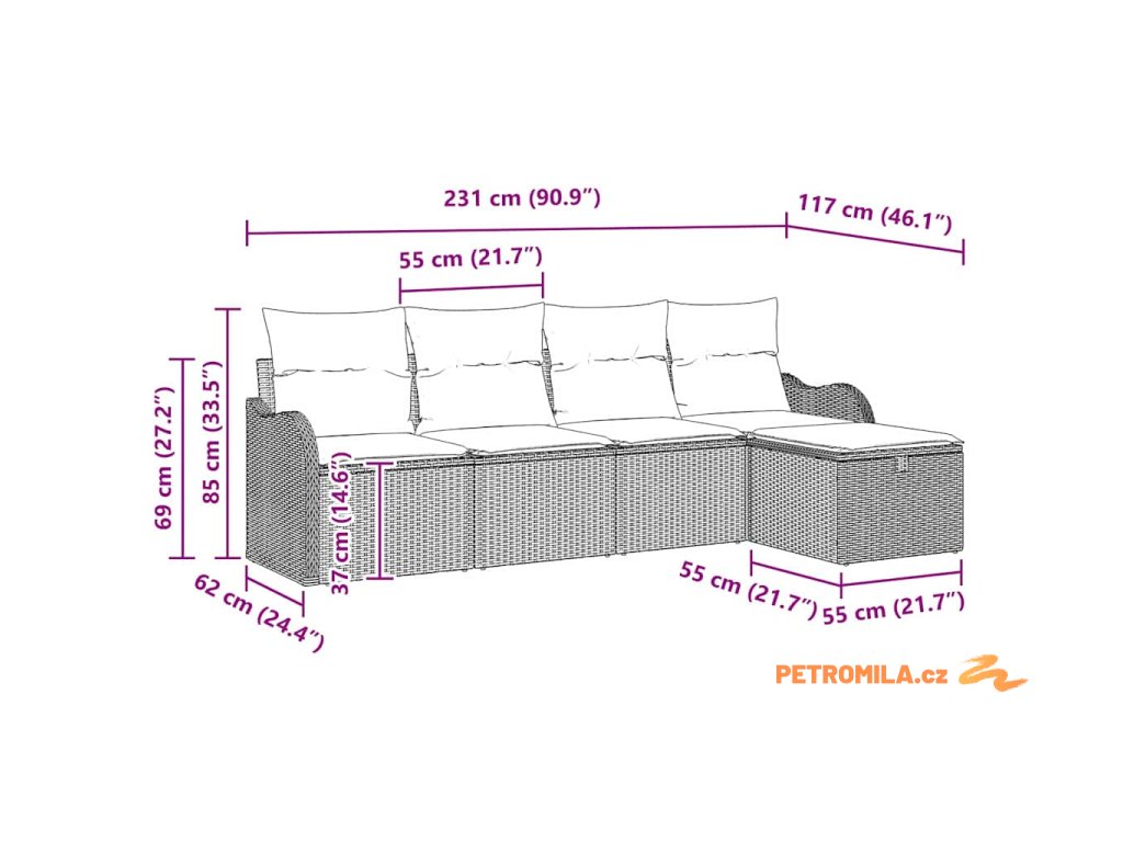 - Celkové rozměry: 231 x 117 x 85 cm (D x Š x V)