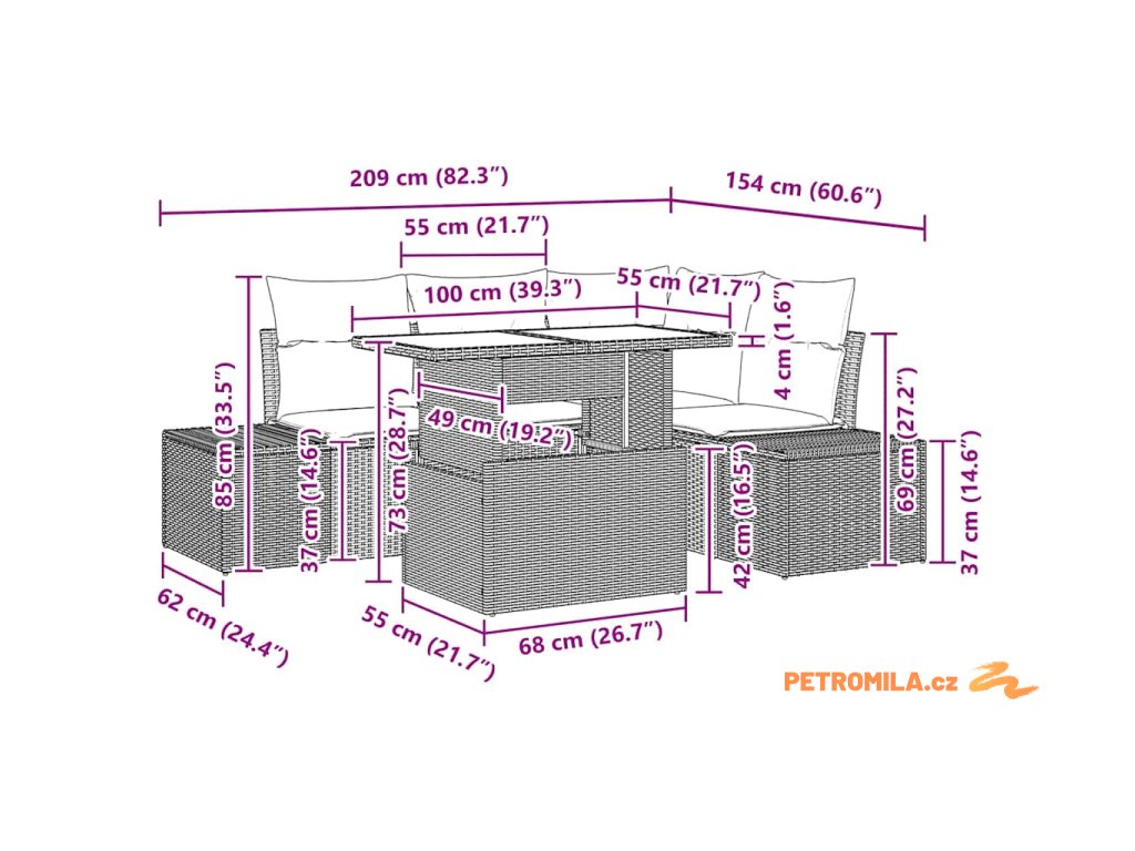 - 1 x Rohové sedadlo: 62 x 55 x 85 cm (D x Š x V)