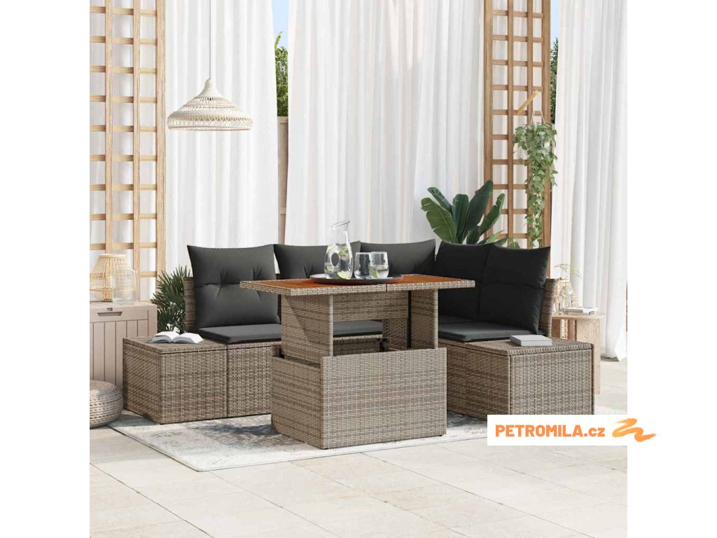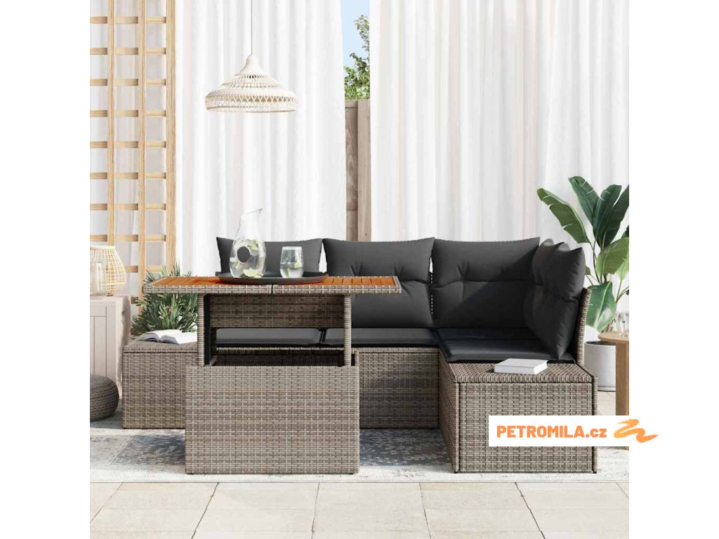 - Materiály: Tento zahradní pohovkový set je vyroben z prémiového poly ratanu, známého pro své vlastnosti odolné vůči počasí a stylovou tkaninou, ideální pro venkovní prostředí. Rám z práškově lakované oceli zajišťuje pevnost a eleganci, zatímco masivní dřevo akácie dodává teplo a přírodní vzhled, který ladí s jakoukoli zahradní dekorací.