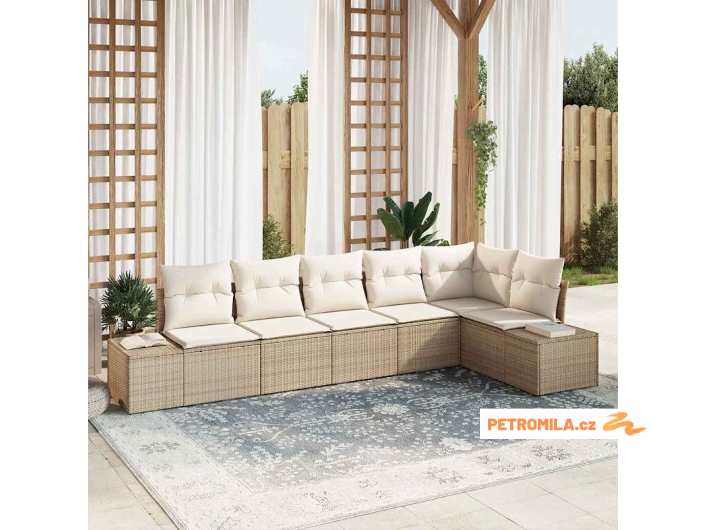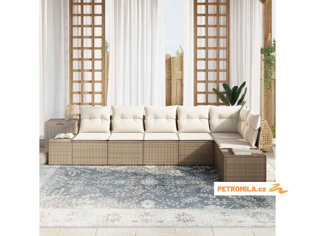7dílný zahradní jídelní set s poduškami béžový polyratan