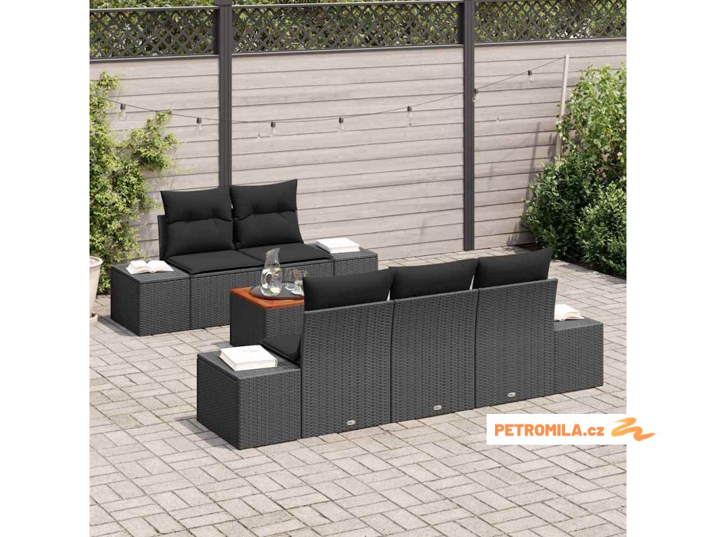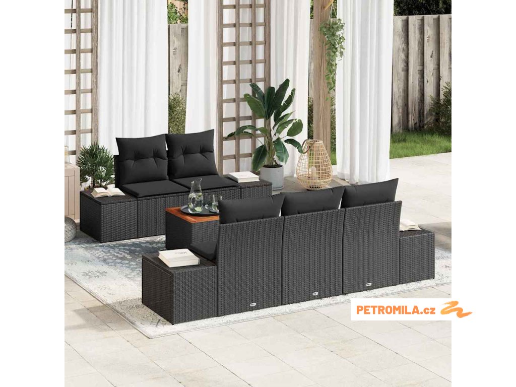 Materiály: Sedací souprava je vyrobena z odolných materiálů, včetně poly ratanu tkaného kolem práškově lakovaného ocelového rámu a doplněného o celistvé akáciové dřevo. Tyto materiály zajišťují stabilitu a dlouhou životnost, čímž jsou ideální pro venkovní rekreaci. UV-odolné vlastnosti chrání před tvrdým slunečním zářením, udržují soupravu vypadat prvotřídně i po čase.,Součásti: Tato souprava zahrnuje více kusů: hlavní centrální sedadlo s úložným prostorem, více pohovek a zahradní stůl, každý vybaven voděodolnými úložnými taškami. Tyto komponenty jsou navrženy tak, aby zvýšily funkčnost a zajistily harmonické propojení s přírodou při maximalizaci prostorové efektivity.,Funkce / Design: S modulární konstrukcí poskytuje souprava všestrannost v uspořádání sezení. Nastavitelné nožičky umožňují uživatelům přizpůsobit výšky pro rovné terasy nebo travnaté plochy, což zajišťuje dodatečný komfort pro prodloužené sezení. Její čisté, moderní linie hladce zapadají do různých designových estetik.,Odporučené použití: Ideální pro zahrady, terasy a zahrady, tato souprava uspokojuje sezónní setkání, osamělou relaxaci nebo neformální stolování. Elegantní vzhled a funkční atributy podporují různé nastavení, od jarního brunchu až po letní lenošení.,Péče a údržba: Správná péče prodlužuje životnost tvého nábytku. Chraň ho krytem, když není používán, aby si udržel svěží vzhled. Snadná údržba nabádá k dalšímu užívání této úžasné venkovní sezení.- Barva: Černá