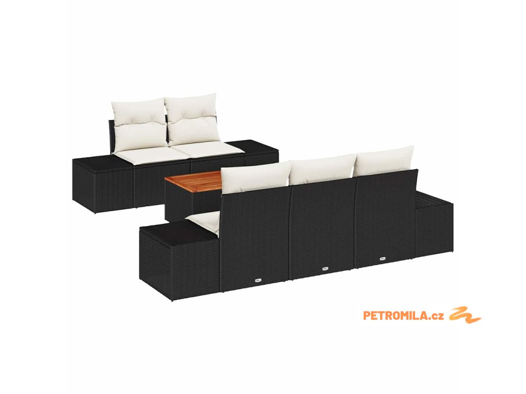 Materiály: Sedací souprava je vyrobena z odolných materiálů, včetně poly ratanu tkaného kolem práškově lakovaného ocelového rámu a doplněného o celistvé akáciové dřevo. Tyto materiály zajišťují stabilitu a dlouhou životnost, čímž jsou ideální pro venkovní rekreaci. UV-odolné vlastnosti chrání před tvrdým slunečním zářením, udržují soupravu vypadat prvotřídně i po čase.,Součásti: Tato souprava zahrnuje více kusů: hlavní centrální sedadlo s úložným prostorem, více pohovek a zahradní stůl, každý vybaven voděodolnými úložnými taškami. Tyto komponenty jsou navrženy tak, aby zvýšily funkčnost a zajistily harmonické propojení s přírodou při maximalizaci prostorové efektivity.,Funkce / Design: S modulární konstrukcí poskytuje souprava všestrannost v uspořádání sezení. Nastavitelné nožičky umožňují uživatelům přizpůsobit výšky pro rovné terasy nebo travnaté plochy, což zajišťuje dodatečný komfort pro prodloužené sezení. Její čisté, moderní linie hladce zapadají do různých designových estetik.,Odporučené použití: Ideální pro zahrady, terasy a zahrady, tato souprava uspokojuje sezónní setkání, osamělou relaxaci nebo neformální stolování. Elegantní vzhled a funkční atributy podporují různé nastavení, od jarního brunchu až po letní lenošení.,Péče a údržba: Správná péče prodlužuje životnost tvého nábytku. Chraň ho krytem, když není používán, aby si udržel svěží vzhled. Snadná údržba nabádá k dalšímu užívání této úžasné venkovní sezení.- Barva: Černá a bílá
