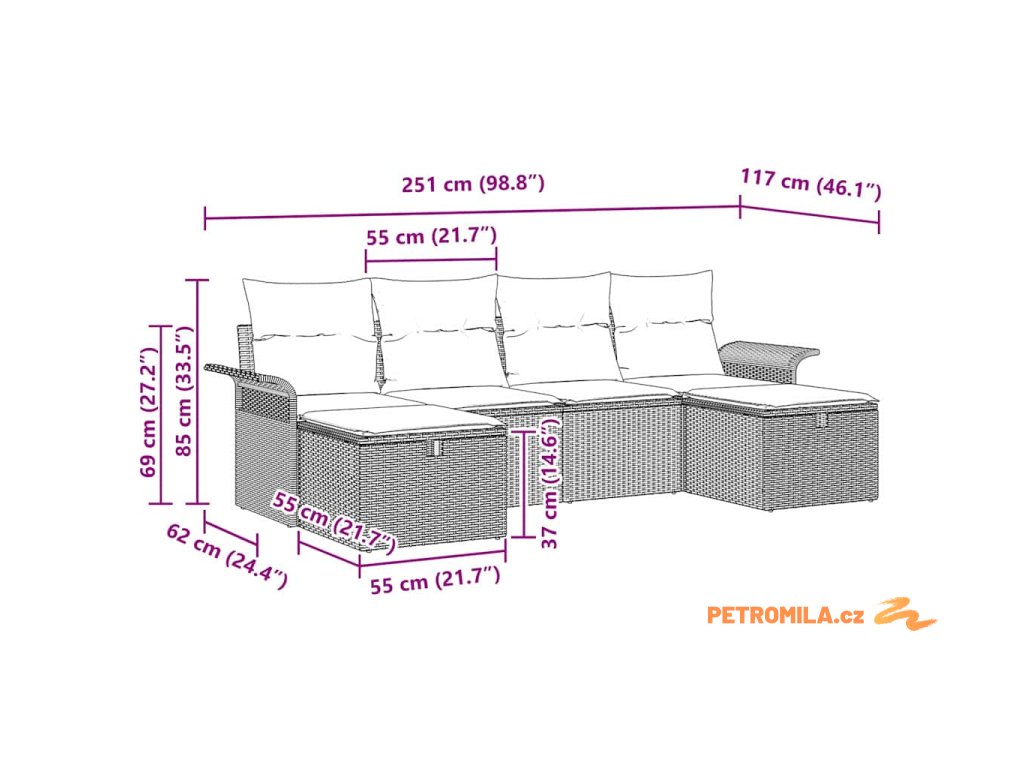 - Celkové rozměry: 251 x 117 x 85 cm (D x Š x V)