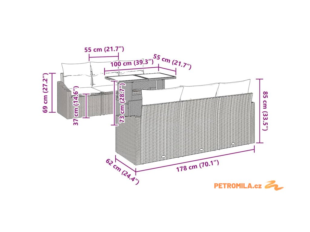 - 2 x střední sedák: 55 x 62 x 69 cm (D x Š x V)