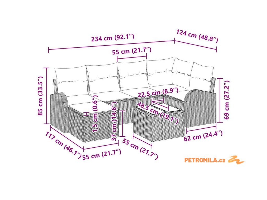 - Pohodlné vlastnosti: Souprava má odnímatelný a pratelný polštář, což usnadňuje údržbu. Ergonomické opěry zad a rukou zajistí skvělý zážitek při sezení, ideální na lenošení nebo večerní párty.