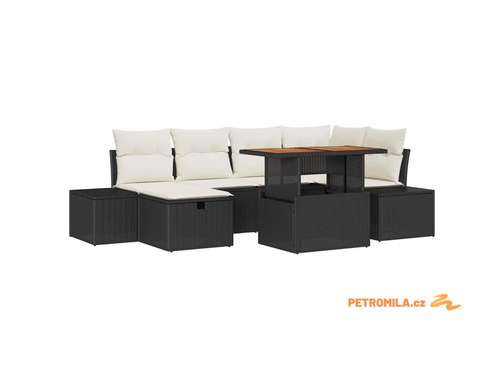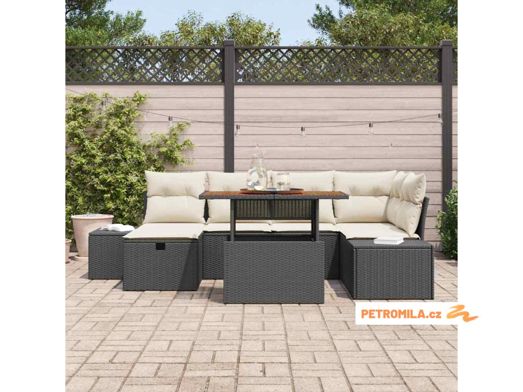 7dílný zahradní jídelní set s poduškami černý polyratan