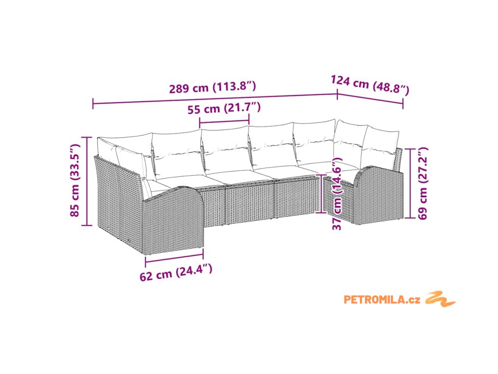 - Zahrnuté součásti: Souprava obsahuje dvě rohová sedadla, tři středová sedadla a dvě opěrné pohovky, každé s polyesterovým sedákem pro pohodlí a minimalistický vzhled. Zakřivené opěrky rukou z poly ratanu nabízejí ergonomickou podporu pro příjemné sezení.
