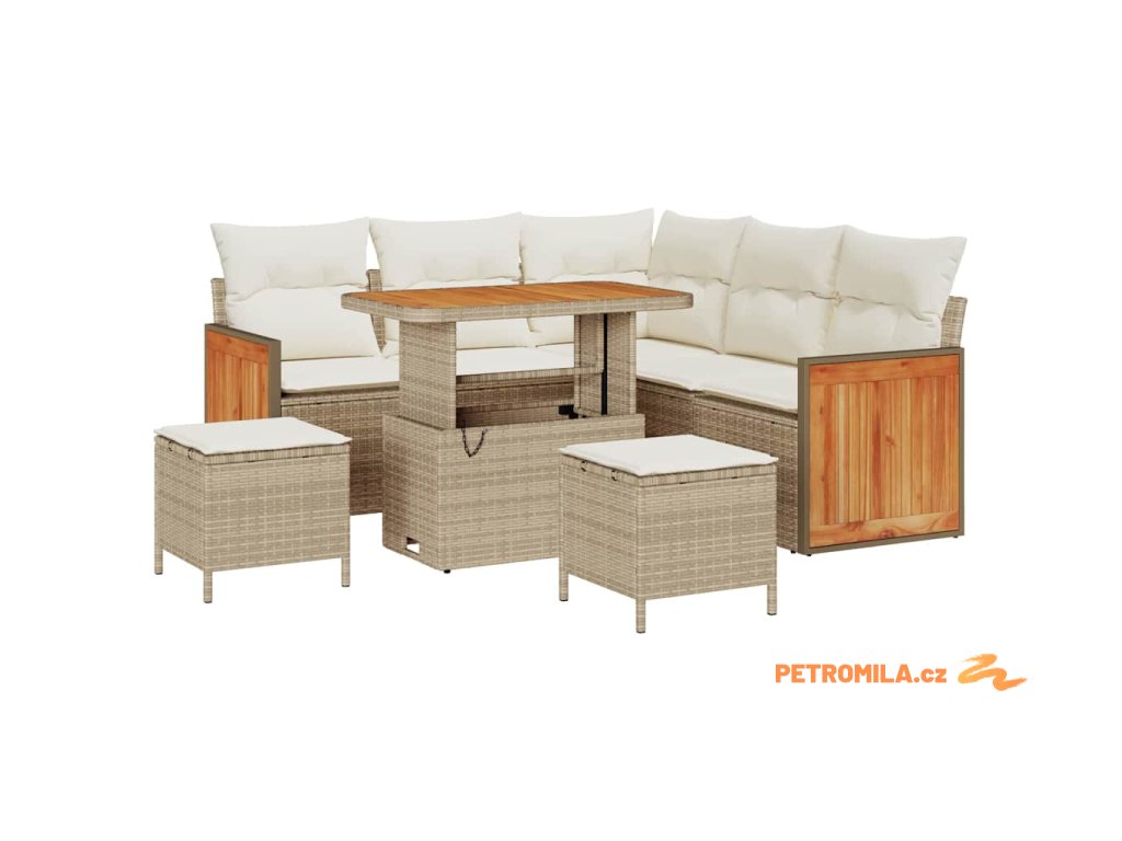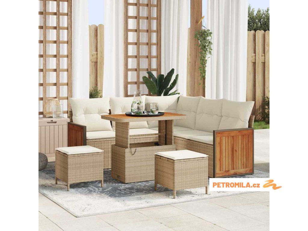 - Super materiály: Z poly ratanu a pevných akáciových částí, tohle je pohovkový set, co vydrží. Odolá dešti i slunci a vypadá prostě skvěle – hodí se do každého stylu zahrady.