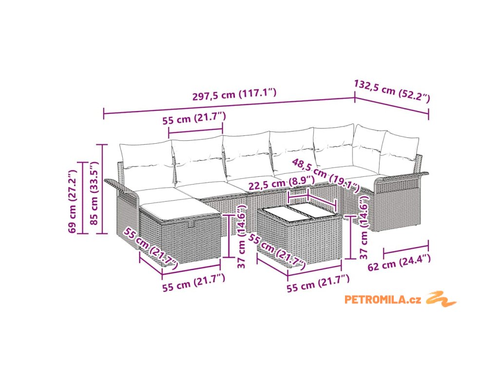 - Celkové rozměry: 297,5 x 132,5 x 85 cm (D x Š x V)