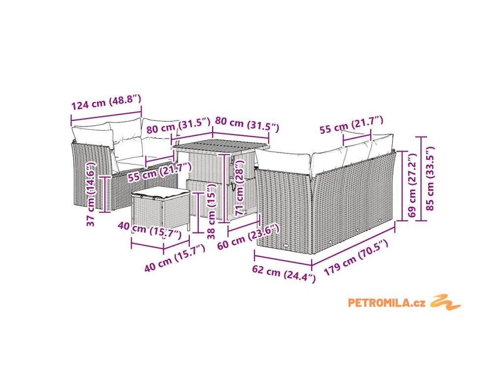 - 1 x Středové sedátko: 55 x 62 x 85 cm (ŠxHxV)