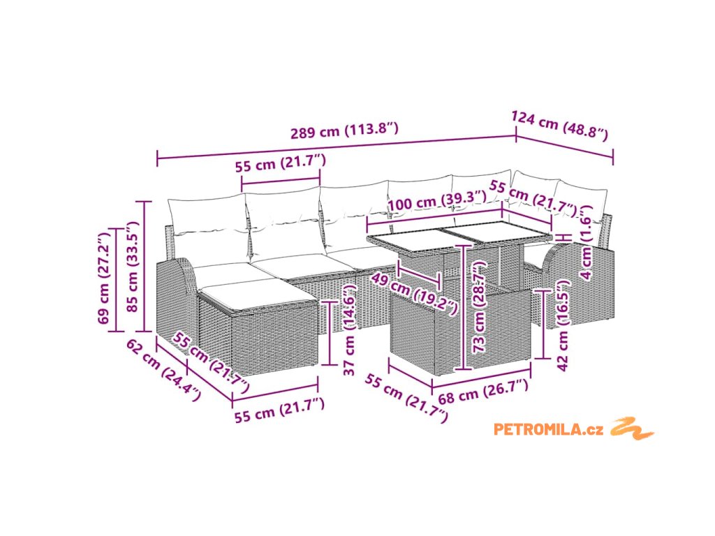 - 3 x Střední sedačka: 55 x 62 x 69 cm (D x Š x V)