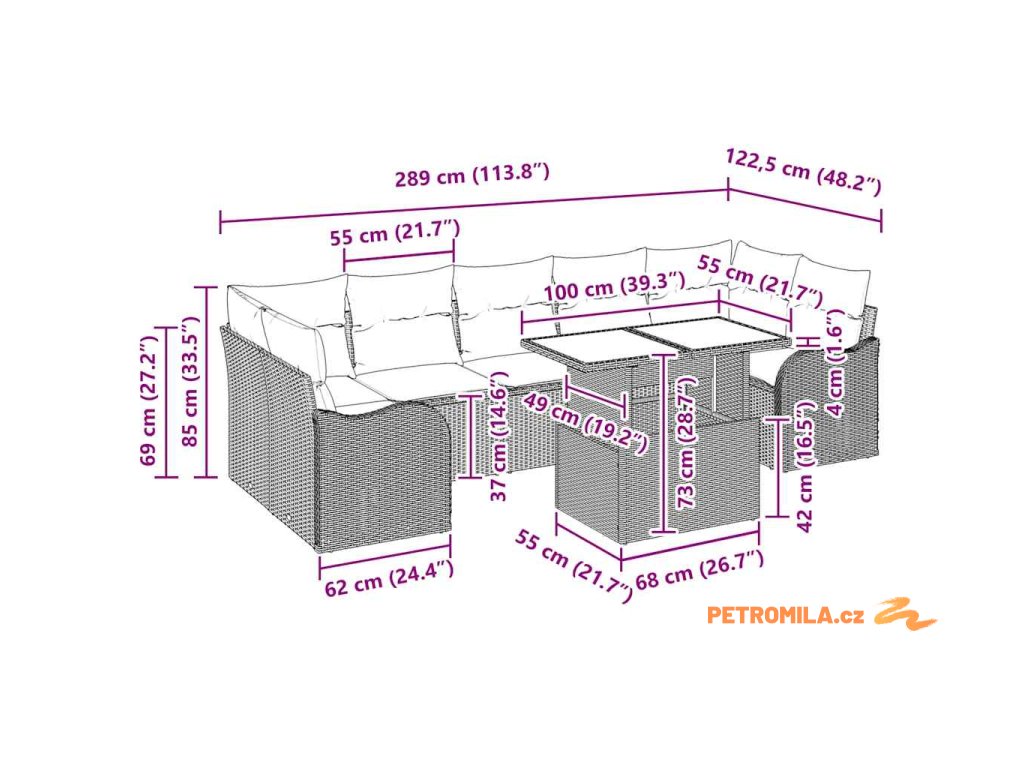 - 2 x Rohové sedadlo: 62x62x85 cm (ŠxHxV)