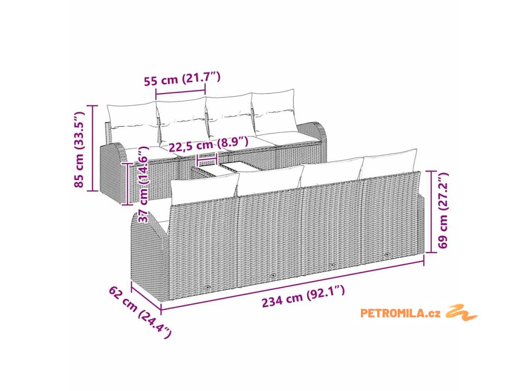 - Úplné komponenty Tato souprava obsahuje 4 střední sedačky, 4 křesla a stůl, vše vyrobené z poly ratanu s polštáři plněnými pěnou pro maximální pohodlí. Každý kousek má práškový povrch, což přispívá k atraktivnímu a pevnějšímu vzhledu.