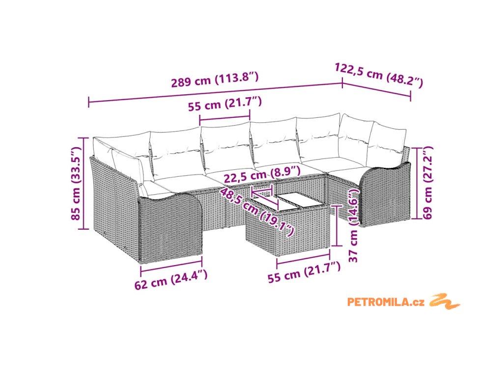 - Celkové rozměry: 289 x 122,5 x 85 cm (D x Š x V)