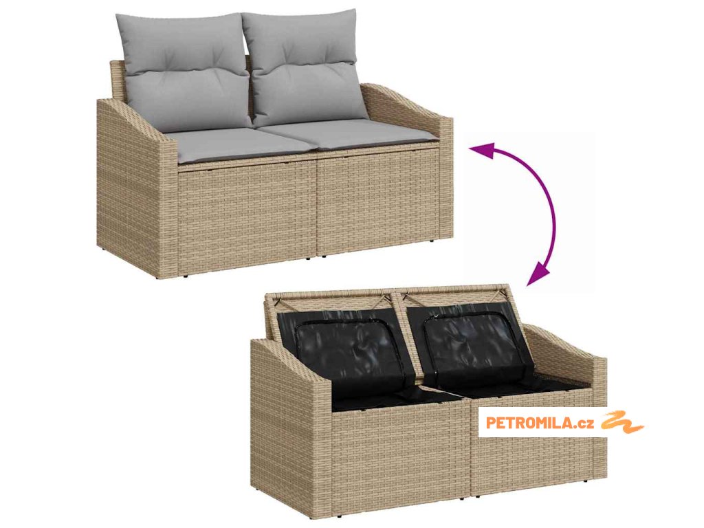- Údržba: Prodelší životnost soupravy doporučujeme používat kryt, když ji zrovna nepotřebujete, čímž ji ochráníte před vnějšími vlivy. Pravidelně ji uklízejte lehce mýdlovou vodou, abyste udrželi její vzhled, a polštáře ukládejte dovnitř během špatného počasí, abyste je ochránili před vlhkem.