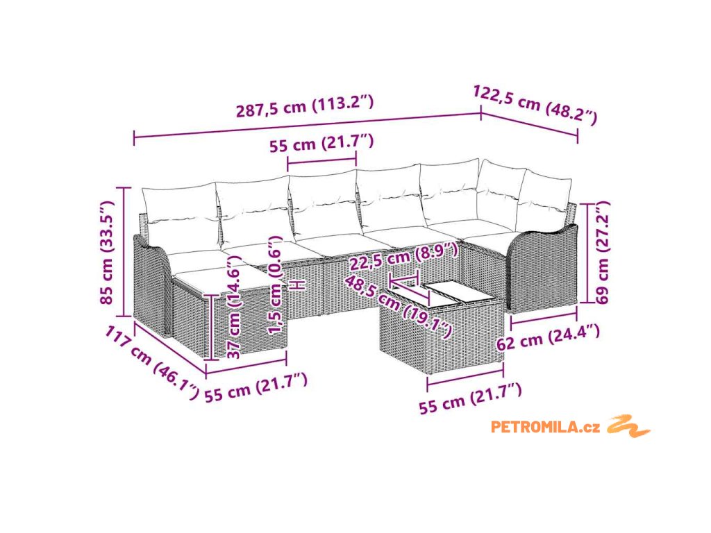 Sada zahradních pohovek s polštářem 8 pcs Šedá Poly ratan