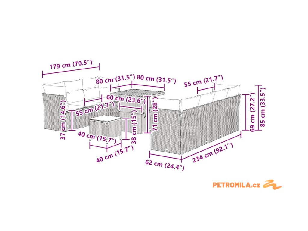 - 4 x Rohové sedadlo: 62 x 62 x 69 cm (D x Š x V)