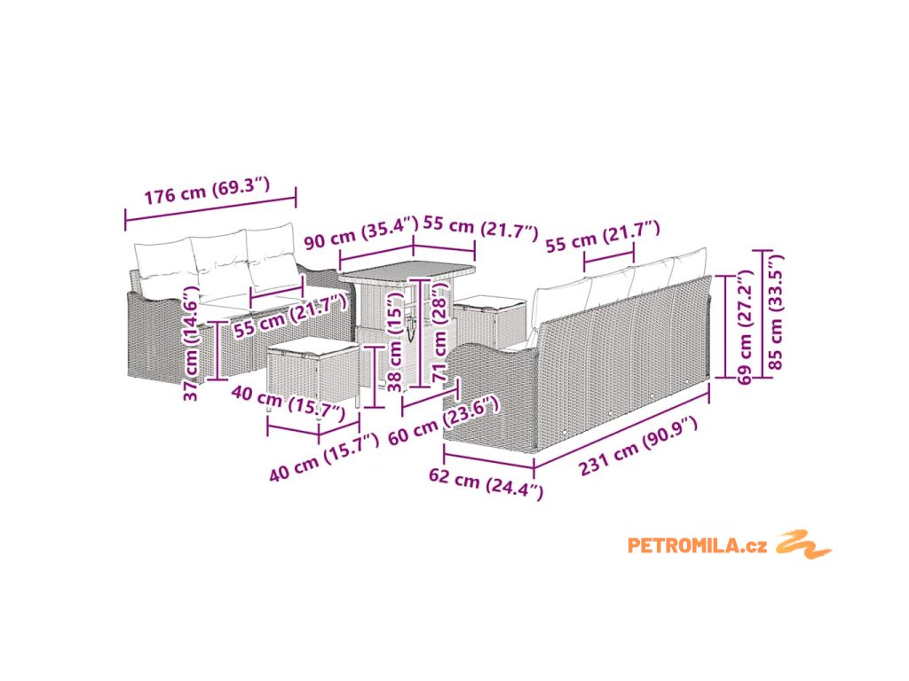 Sada zahradních pohovek s polštářem 10 pcs Šedá polyratan
