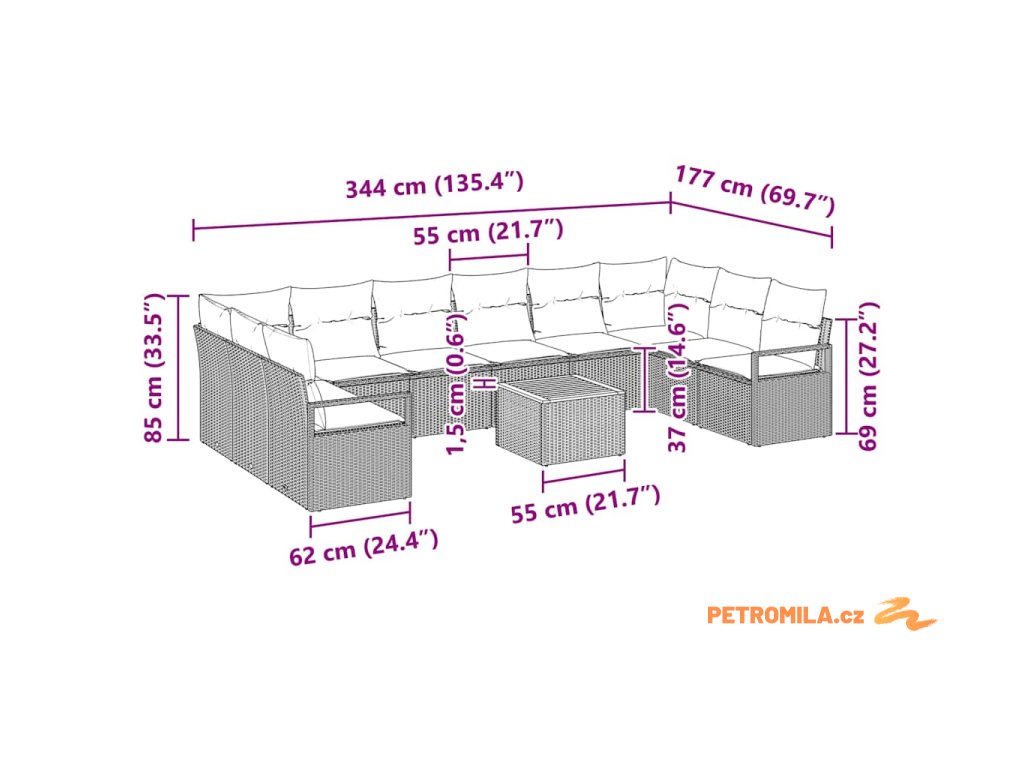 - 6 x Střední sedák: 55 x 62 x 85 cm (DxŠxV)