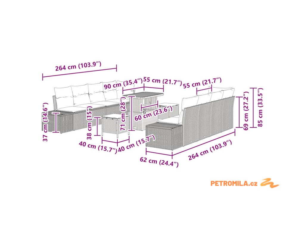 - 4 x Středové sedátko: 55 x 62 x 85 cm (ŠxHxV)
