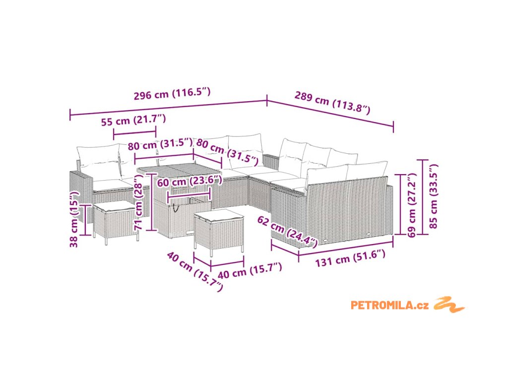 - 4 x Křeslo rozkládací sofa včetně úložné funkce s voděodolnou taškou, 6 x Střední sedák včetně úložné funkce s voděodolnou taškou, 2 x Čtvercová taburetka, 1 x Stůl